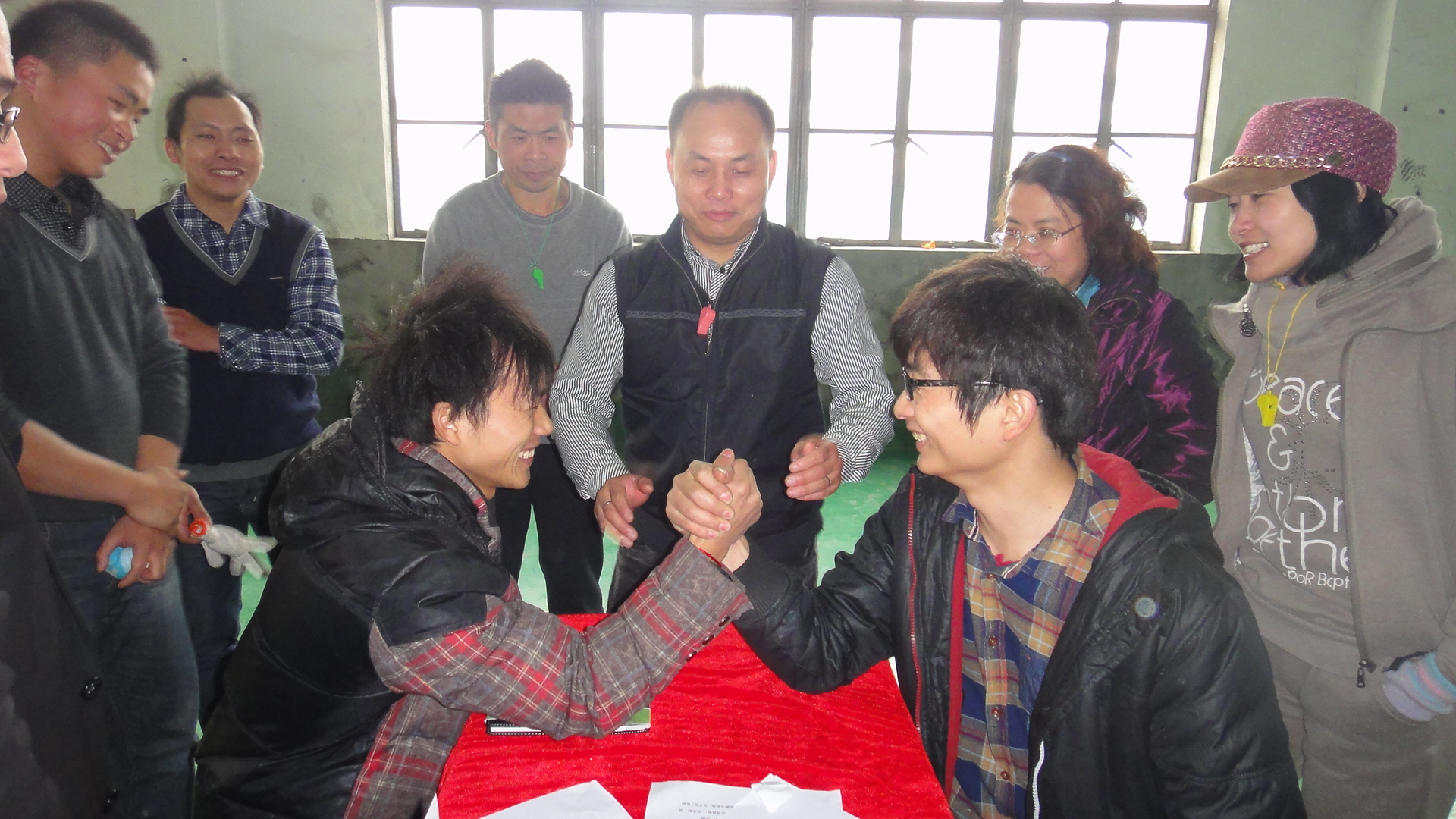 茂控男士進行了一場力量的角逐--扳手腕。扳手腕不僅要看你肘部力量,更重要是力量能否全部用上。這要注意手高度,坐的位置,用力的方向。李耀宗拿到了扳手腕冠軍,李貴有拿到了扳手腕亞軍。